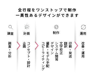 ワンストップ対応すべて社内制作している為、窓口が一本化され、ブランドの世界観など、統一されたデザイン品質でサポートします。